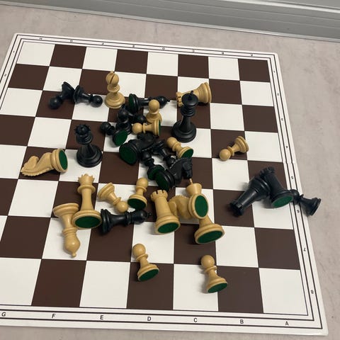 Sjakkspill med brett og brikker i plast. Brettet har ruter i svart og hvitt, og brikkene er i svart og hvitt. Spillet inkluderer standard sjakkbrikker og brett med mål ca. 40 cm i bredden.