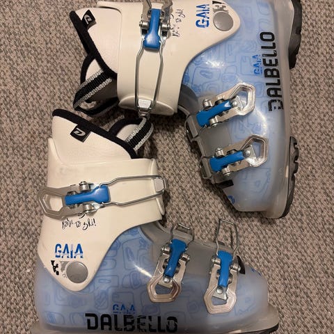 Dalbello Gaia 4 alpinstøvel i grå og blå farge. Støvelen har fire spenner og borrelåsrem for god tilpasning. Passer for unisex bruk. Størrelse 22,5 - 36 EU. Passer for barn.