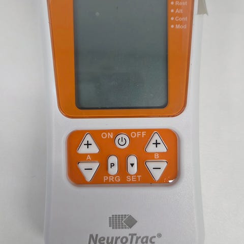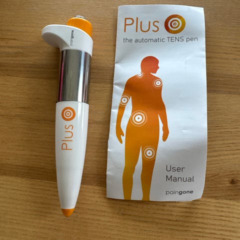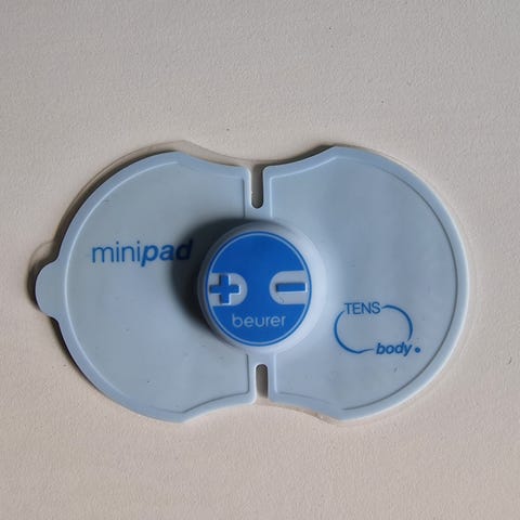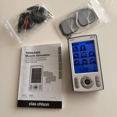 Tens-apparatet er kun brukt noen få ganger og følger med 4 stk elektroder, samt ledninger for å koble opp disse. I tillegg følger det med en helt nyinnkjøpt/uåpnet pakke med 8stk ubrukte elektroder som passer til denne maskinen.