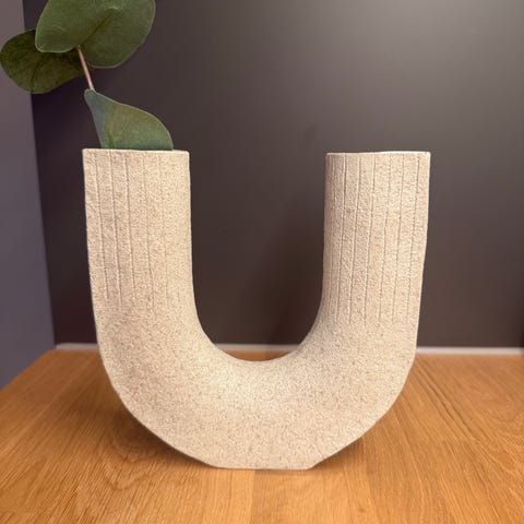 Bloomingville dekorasjonslysestake i beige farge med rund base og to armer for lys. Lysestaken har en høyde på omtrent 20 cm og er laget i et materiale med teksturert overflate. Egnet for bruk som dekorasjon i hjemmet.