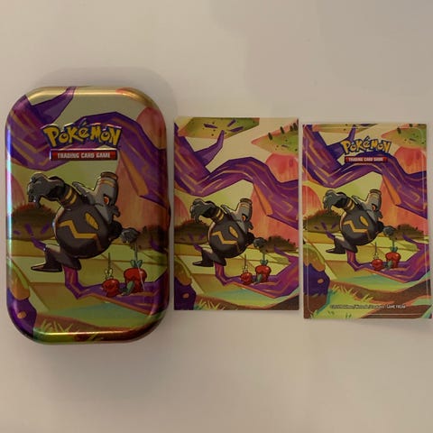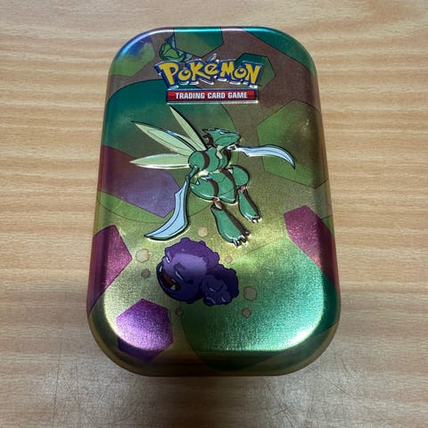 Pokémon TCG metallboks for oppbevaring av Pokémon-kort. Boksen har et motiv av Pokémon og inkluderer flere plastlommer for kortbeskyttelse.