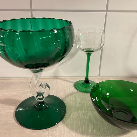 Grønland-serie med skåler, fat og bolle i klart grønt glass med boble-mønster (luseglass) fra Hadeland Glassverk designet av Arne Jon Jutrem.