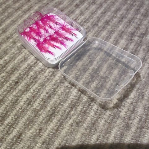 Fluer 4 stk orange rekeimmitasjon sjøørret i plastboks.