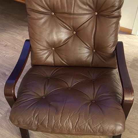 Stol trukket i tykt skinn, med mykere polstret sete. Må hentes eller bringes Tønsberg.