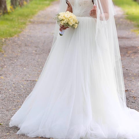 Selger brudekjole fra Milla Nova. Kjolen er costume made variant av Eridana og bestilt via Anna Johnson. Selger også armer som kan kjøpes i tillegg. Kjolen kostet 32000 inkludert skredder (u.armer). Ferdig renset. Knapper hele veien bak.