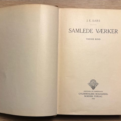 Komplett sett med J.E. Sars – Samlede verker, utgitt av Gyldendalske Boghandel / Nordisk Forlag, Kristiania og København, 1911.