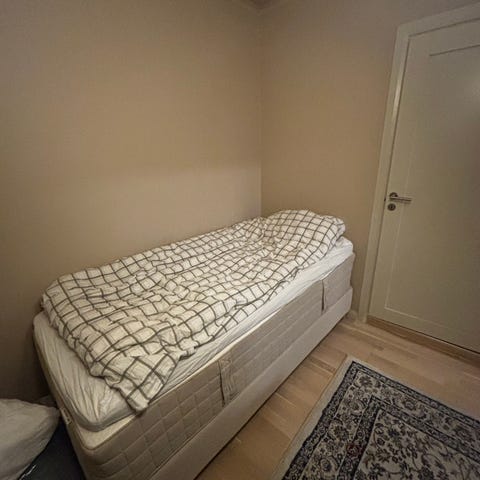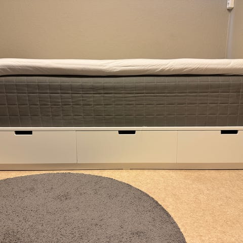 IKEA seng med madrass i størrelse 90x200 cm. Madrassen har grått trekk med mønster. Passer til enkeltrom eller gjesterom. Dyne og sengetrekk følger ikke med