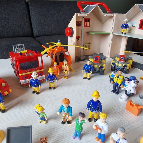 Sønnen vår selger sin store samling Brannmann Sam leker. Selges samlet. Nypris er over 4000,- . Noen småskader (se beskrivelse) men stort sett meget fin stand.