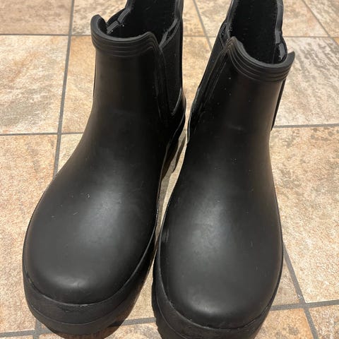 SWIMS støvler i størrelse 38, svart/blå farge. Laget i vanntett materiale med gummisåle, designet for å gi beskyttelse mot vått vær. Støvlene har elastiske sidepaneler for enkel på- og avkledning.
