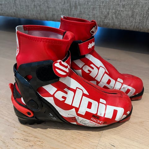 Alpina junior kombisko i rød og svart farge. Skoene har borrelåsfeste og glidelås for enkel påkledning. Yttersåle med godt grep. Egnet for skøyteskiaktiviteter. Litt små i størrelse