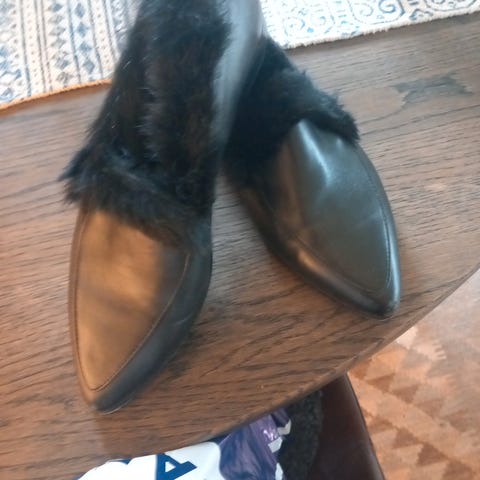 Nydelige sorte skinnsko med chunky såle fra Laura Bellariva. Detaljer med pels på vristen av skoene. Brukt få ganger, så fremstår som nye. Nypris var kr 2.700,-