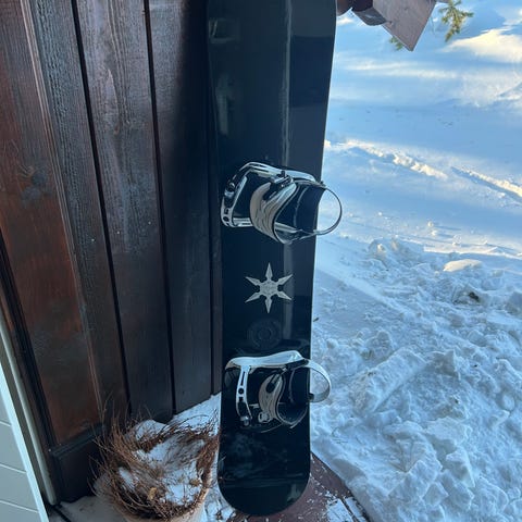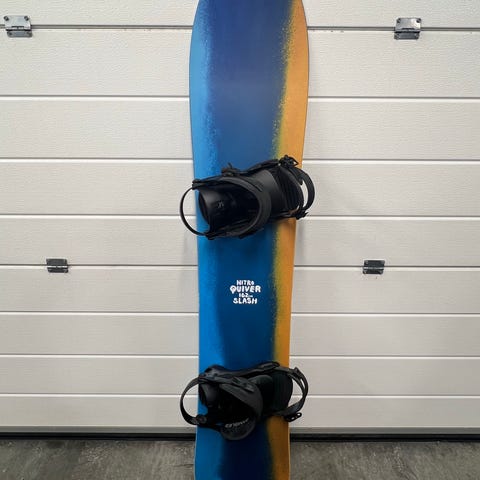 Nitro Ripper 137 snowboard med Nitro Charger bindinger i M størrelse. Snowboardet er pent brukt og har vanlige bruksmerker i sålen. Brettet er satt med med voks for lagring og ser derfor litt ujevn ut i sålen på bildet.