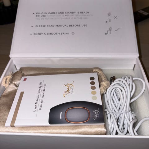 IPL hårfjerningsapparat i hvit farge. Designet for hårfjerning ved hjelp av intens pulserende lys (IPL). Passer til hjemmebruk.