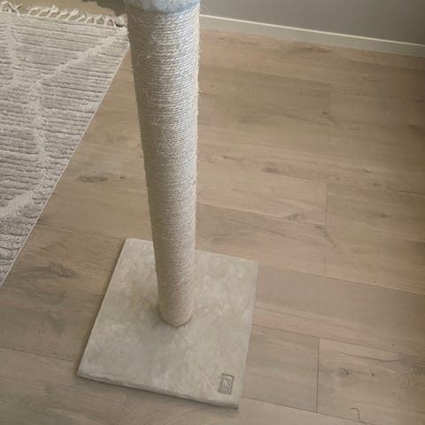 Stort og solid klatre og klorestativ for katt med flere plattformer, hengekøye, liggeplasser og kloreflater. Materialer inkluderer plysjstoff og sisal for kloring. Farger i beige og grå/hvit. Passer for katter som liker å klatre, hvile og leke. Er flere lekestasjoner og mine to katter elsker denne.