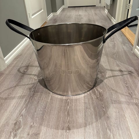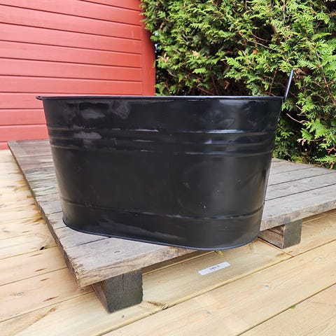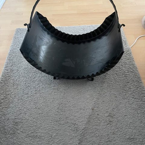 Pent brukt vedkurv i sortlakkert metall. Kurven har et hengslet håndtak for å enkelt kunne bære eller flytte på kurven. Den ble kjøpt på Bohus eller liknende interiørbutikk for et par år siden.