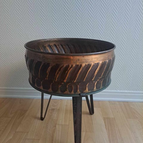 Diameter er ca 40 cm. Rundt 20 cm høy.