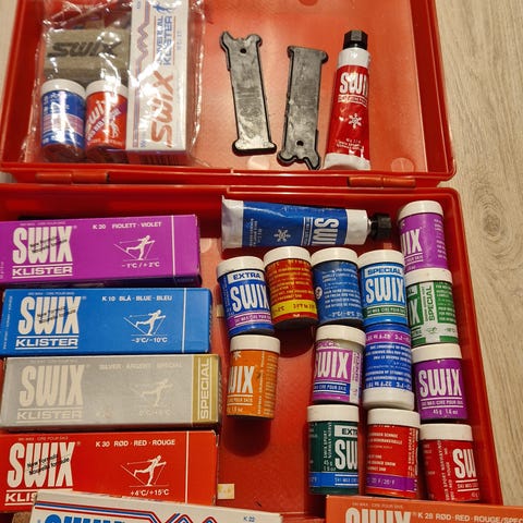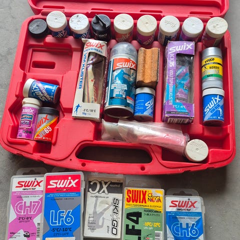 Swix skismøringssett som inneholder flere typer smøring for ulike temperaturer og snøforhold, inkludert klister og parafinbaserte produkter. Settet inkluderer også tilbehør som skismøringsjern, korker og påføringsutstyr. Egnet for preparering av ski for vinterbruk.