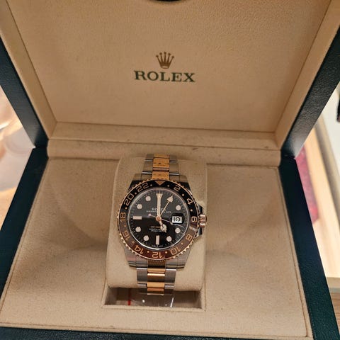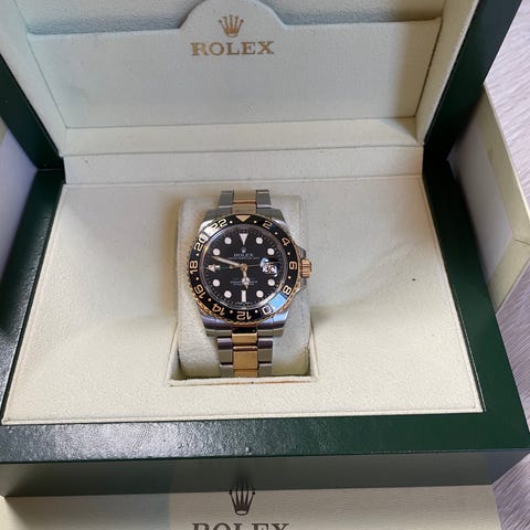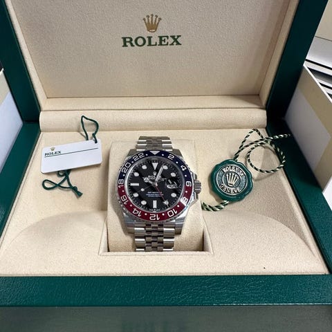 Selger en Rolex GMT-Master II Pepsi, referanse 126710BLRO, kjøpt ny i 2024. Jeg er 2 eier på klokken, og den er kjøpt av GG i klokkemiljøet.