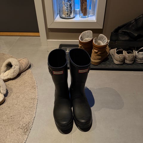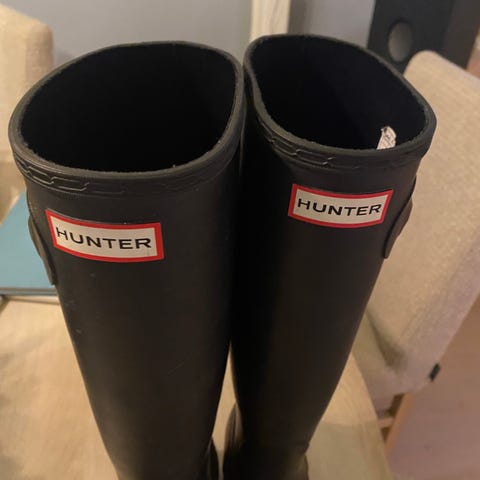 Hunter regnstøvler i størrelse 38, farge svart. Støvlene er laget av vanntett materiale og er designet for å beskytte føttene mot regn og våte forhold.