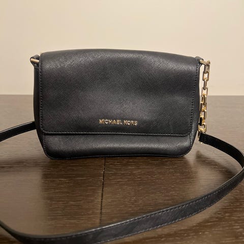 Dette er en Michael Kors Ava ekstra-liten crossbody-veske i sølvfarget Saffiano-skinn.