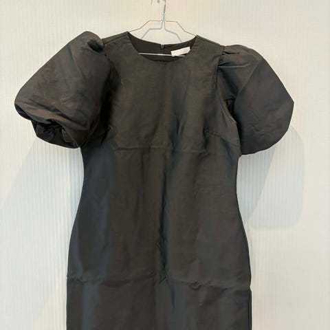 Laget av paljetter i svart farge. Kjolen har lange ballongermer