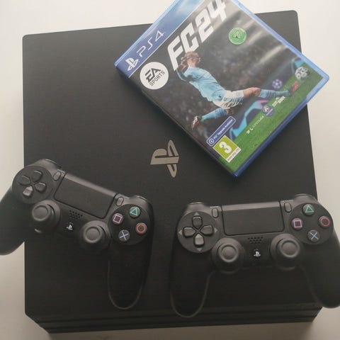 Sony Playstation 4 Pro med 1 terrabyte til salgs. Inkluderer to svarte kontroller, strømforsyning og ladestasjon.