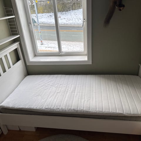 Denne kan imidlertid ikke bygges om til en høy dobbeltseng (da ben er knukket), men kan trekkes ut og brukes som en lav ekstraseng. Ved overnattingsbesøk har vi løst dette ved å heve den ved å sette én eller to bruskasser under. Mulig dette kan fikses/repareres. Som enkeltseng fungerer sengen utmerket, og er i GOD stand.