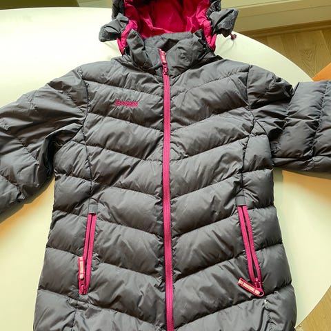 Bergans Wadah Down barnejakke i størrelse 140. Jakken er grå med røde detaljer og er laget med Pertex Quantum materiale. Den er fylt med dun for isolasjon og varme, egnet for utendørs bruk i kaldt vær. Den har hatt ett hull som er lappet (se bilde). Ellers hel og pen.