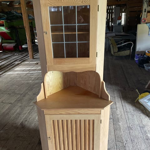 Hjørneskap, mest sannsynlig fra IKEA, selges. Det er 163 cm bredde på den lengre siden og 82 cm på den kortere. Dører med glass paneler.