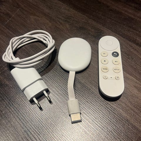 Google Chromecast med Google TV er en streaming-enhet som kobles til TV-en for tilgang til ulike strømmetjenester som YouTube, Netflix, Disney+, Viaplay, Spotify, Prime Video og Apple TV. Enheten leveres med fjernkontroll og gir mulighet for enkel navigering og kontroll av innhold.