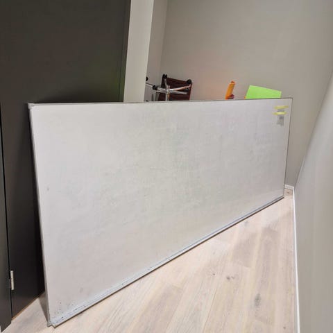 Selger en whiteboard på 1,8x1,2 meter. Magnetisk. Kan veggmonteres (hull til dette i hjørnene). Brukt på barnerom.