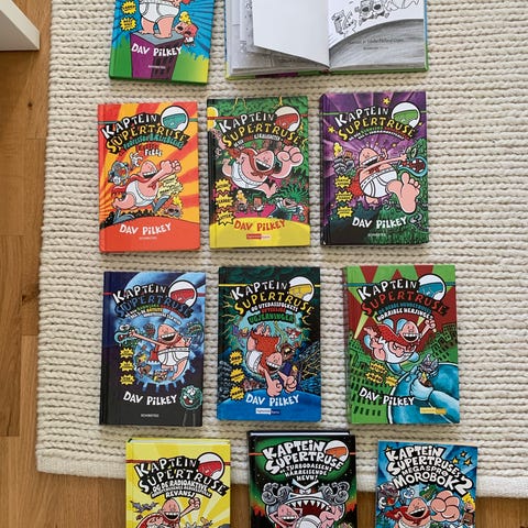Dav Pilkey Kaptein Supertruse bokserie bestående av flere bøker. Barnebøker med humoristisk innhold, illustrert og skrevet av Dav Pilkey.