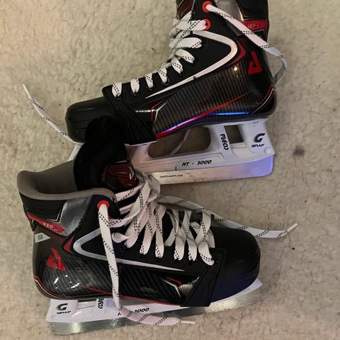 Ishockeyskøyter for barn i størrelse 36. Skøytene har svart og rød farge med hvite lisser og hvit skøyteplate. Egnet for ishockeysport.