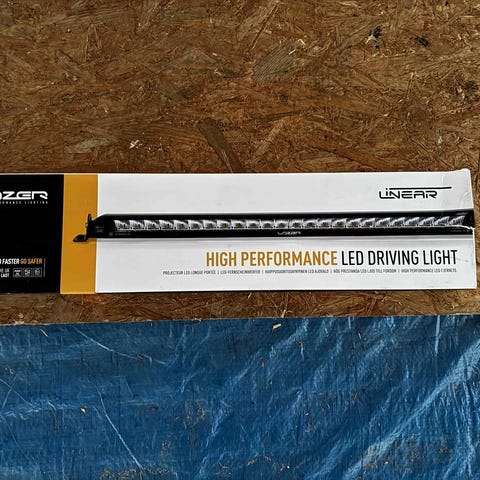 Lazer LED arbeidslys for bilmontering med metallfeste. Produktet har en rektangulær form og er utstyrt med flere LED-lys for belysning. Passer til bruk som ekstra lys på kjøretøy.