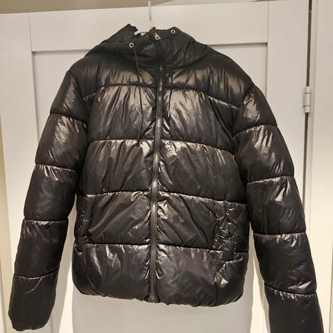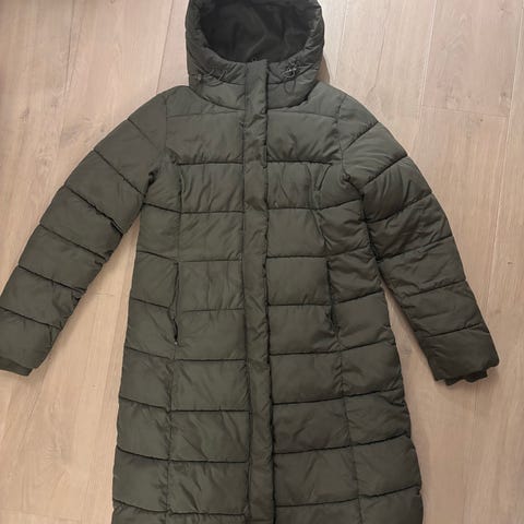 Lager 157 Vinterjakke for dame i størrelse S. Jakken er blå og laget av dun, som gir isolasjon og varme. Egnet for kalde værforhold. Den har et sted under armen som er sydd.