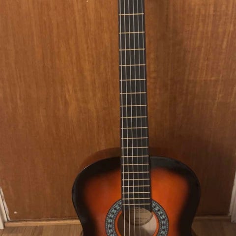 3/4 dels nylonstreng gitar, 90 cm. God lyd og fungerer godt. Pent brukt i mange år. Egner seg bra som nybegynner-gitar til barn/ungdom. Det er flere her i huset som har hatt denne som sin første gitar. Følger med enkel, myk bag som fungerer bra. Kjøpt ny for mange år siden. Må hentes.