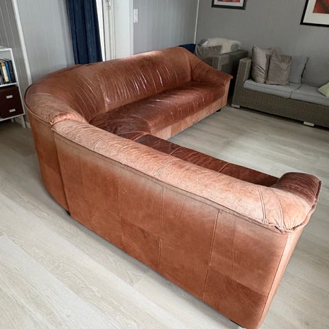 Sort skinnsofa med hvit kontrastsøm i ekte skinn av høy kvalitet. Størrelse 2*3,40 m og pall på 90*90 cm.