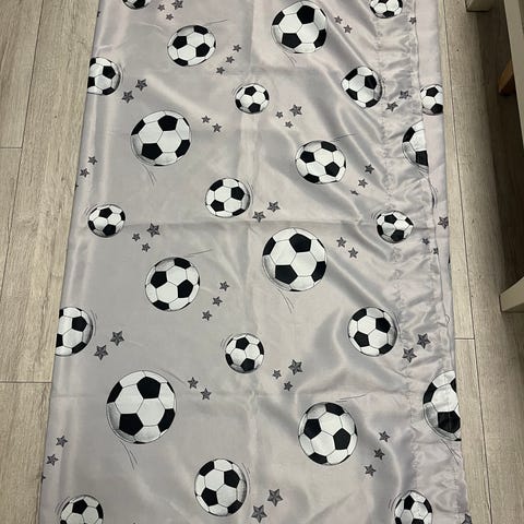 Blå gardiner til barnerom med fotball og sykkelmotiv.