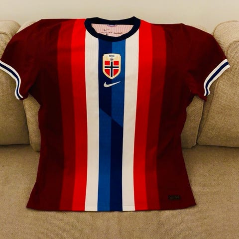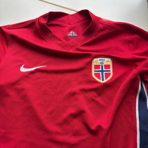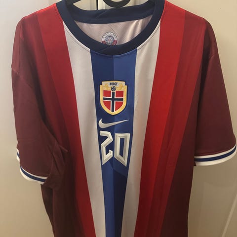 Nike Norge fotballdrakt i størrelse XS (122-128 cm) med Dri-FIT teknologi. Den har navn og nummer på ryggen.