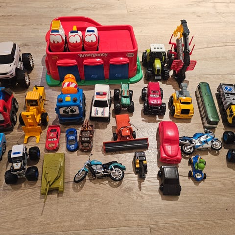 Lekesett bestående av flere små kjøretøy inkludert en traktor, helikopter, brannbil, politibil, og flere små biler i ulike farger. Settet er laget for barn og egner seg til lek med kjøretøy i miniatyr.