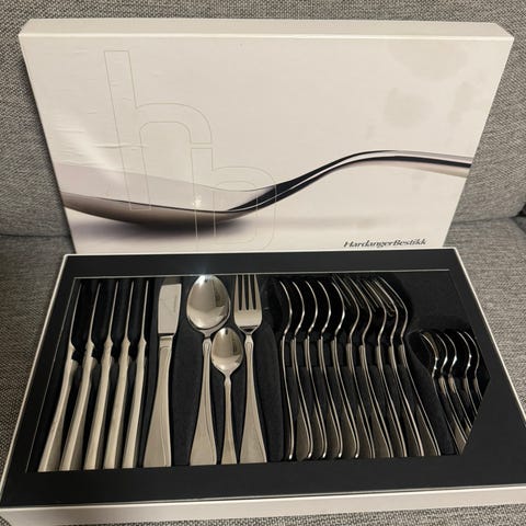 IKEA bestikksett i rustfritt stål består av 11 kniver, 12 gafler, 12 skjeer og 13 spiseskjeer.