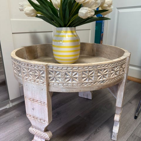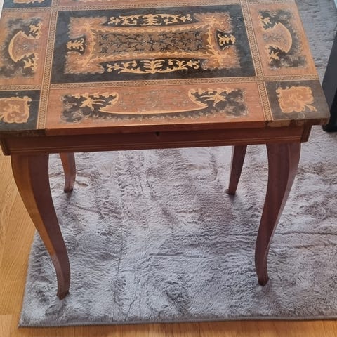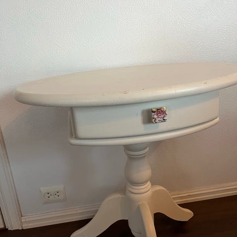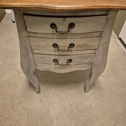 Pent entrebord og speil i tre selges. Bordet har noen bruksmerker langs kanten men speilet er uten merker.