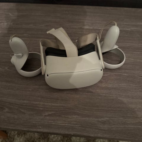 Oculus Quest 3 128 GB VR-headset med to trådløse kontroller, justerbar hodestropp, tilkoblingskabel og silikon face plate Hvit farge. Designet for virtuell virkelighet-opplevelser.