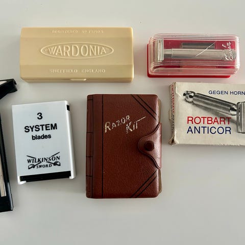 Vintage sikkerhetshøvel /barberhøvel og nye barberblader i Colibri treskrin.