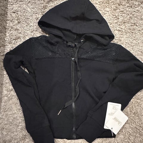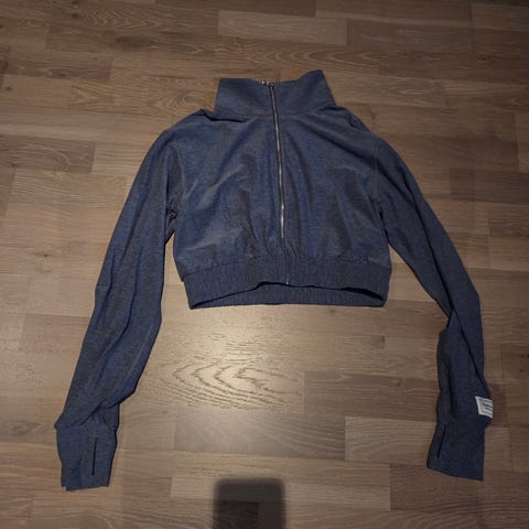 Brukt 1 gang. Crop treningsjakke i mykt stoff. Grå/svart farge. Strl.M. ny pris 1250,-