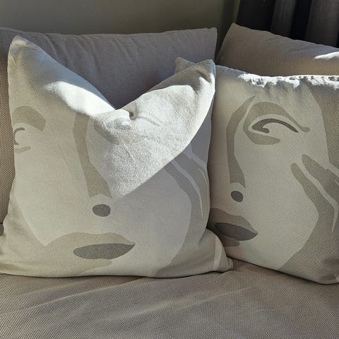Selger 2 stk putetrekk, ett beige og grå-grønn. Putetrekkene har en enkel tekstur og kantdetaljer. Egnet til bruk som dekorative puter i hjemmet.