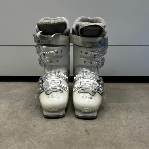 Dalbello Viper 4 alpinstøvler med mondo størrelse 24,5. Støvlene har en kombinasjon av hvit og svart farge. 2 spenner. Varme og komfortable