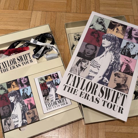 Helt ny Taylor Swift eras tour vip pakke. Inkluderer totebag, pin, 10 postkort, suvenir billett, 4 plakater, lanyard. Det siste bildet er hentet fra nett. Plakatene kommer i en stor konvolutt, denne har noen ørsmå merker fra produksjon. Kan sendes for 70kr med postnord. Fra røykfritt hjem uten dyr
