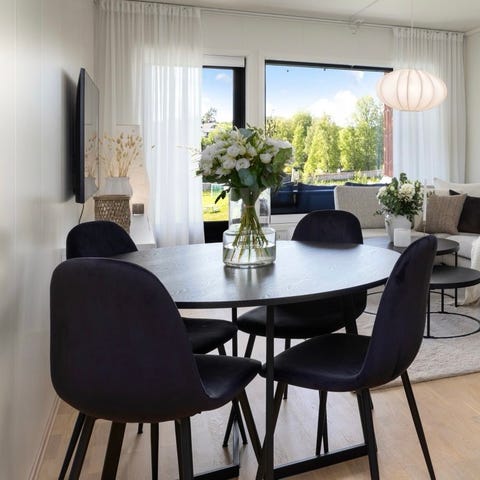 Spisegruppe fra jysk, veldig lite brukt ca 1 år gammelt. ene bordbenet har noen riper/hakk og en stol har bitemerke fra en ivrig valp!