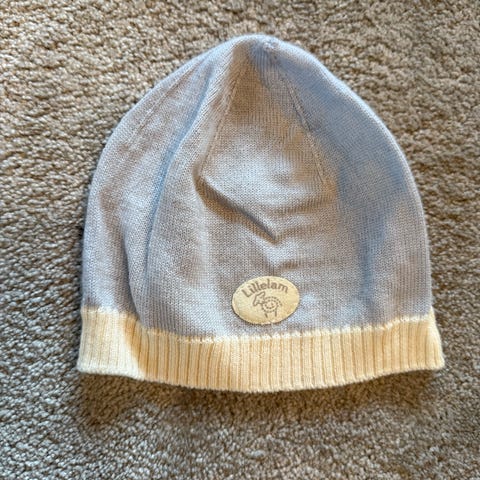 Søt lue i 100 % merinoull fra Lillelam til nyfødt (størrelse 36-38). Den ene snoren har blitt kortere enn den andre, selges derfor billig. Masse bruk igjen.